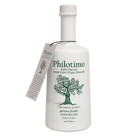 Deze extra vierge olijfolie is vroeg geoogst, ongefilterd en koudgeperst. Philotimo is geperst uit de bekende koroneiki olijf. Deze olijf wordt met de hand geplukt en is rijk aan polyfenolen. Dit is niet alleen gezond maar geeft de olijfolie ook een pittige smaak.